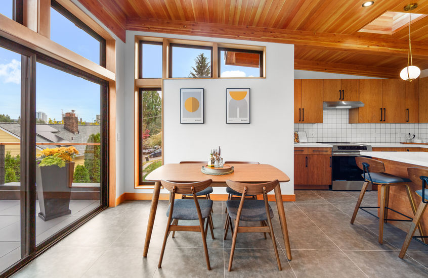 The site is tightly nestled between existing houses perched on a steep slope. Taking advantage of that, the second-floor kitchen and living space opens up to the urban forest and to the right, city high rises reflect the afternoon sunset. The fir ceiling, heated tile floor and vast windows are an ode to Mid-Century Modern, all together combine to create the Wallingford Treehouse.